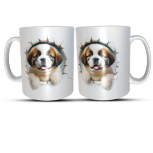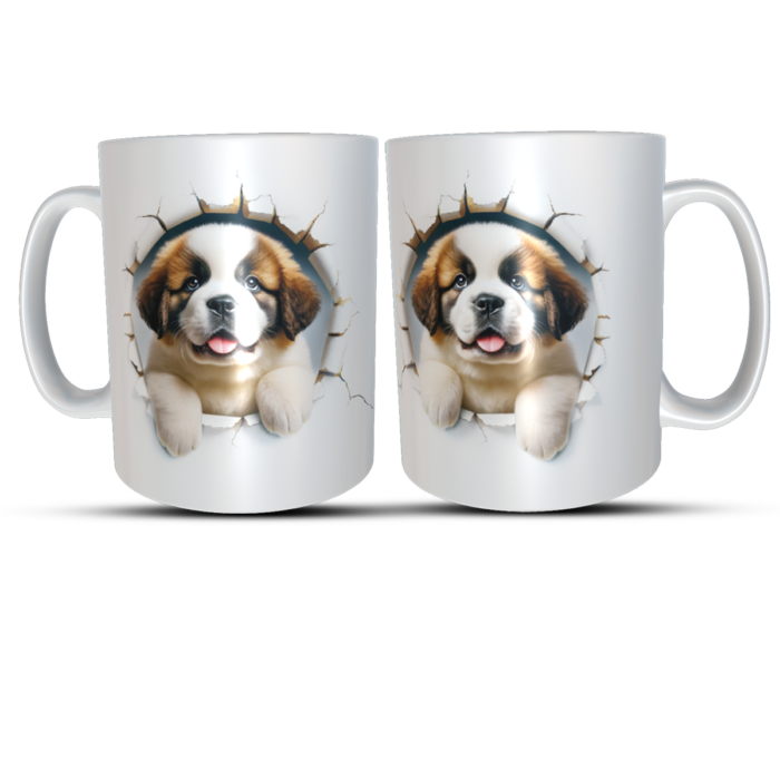 Die „Bernie Breakout – Tasse mit Bernhardiner-Welpen-Motiv“ zeigt einen süßen Bernhardiner-Welpen, der neugierig durch einen aufgebrochenen Hintergrund schaut. Die hochwertige weiße Keramiktasse ist ein niedlicher Hingucker und perfekt für deinen Kaffee, Tee oder Kakao. Ein tolles Geschenk für Bernhardiner-Fans und Hundefreunde! 🐾❤️