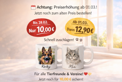 Damit wir weiterhin hochwertige Tassen mit langlebigem Druck und individuellen Tiermotiven anbieten können, passen wir den Preis an.