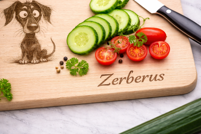 Die hochwertige Lasergravur mit dem Dobermann-Motiv „Dobbi – haarig, herrlich, hungrig“ macht das Brett zu einem besonderen Hingucker.