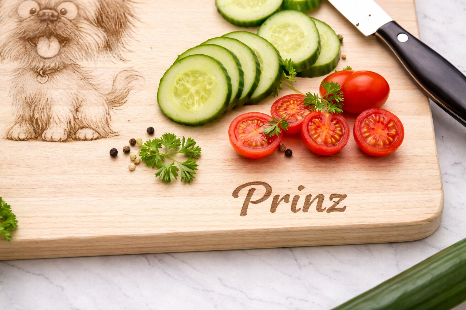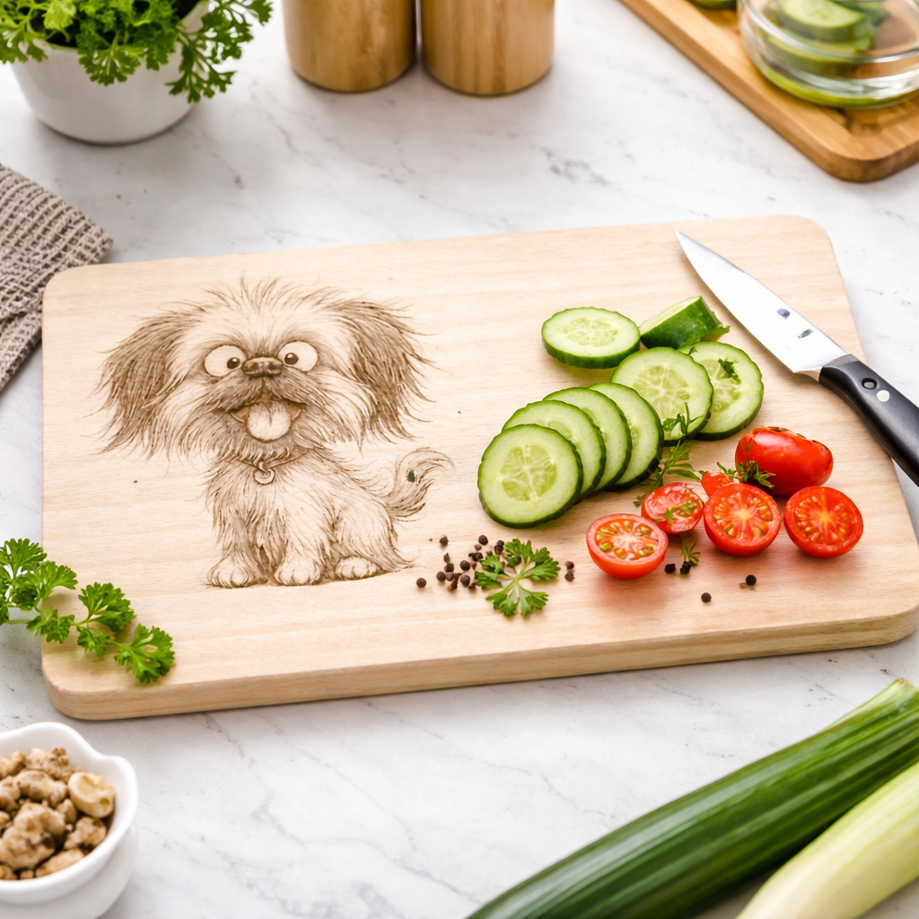 Dieses liebevoll gravierte Holzbrettchen mit lustigem Pekinesen-Motiv ist ein echter Hingucker in jeder Küche.