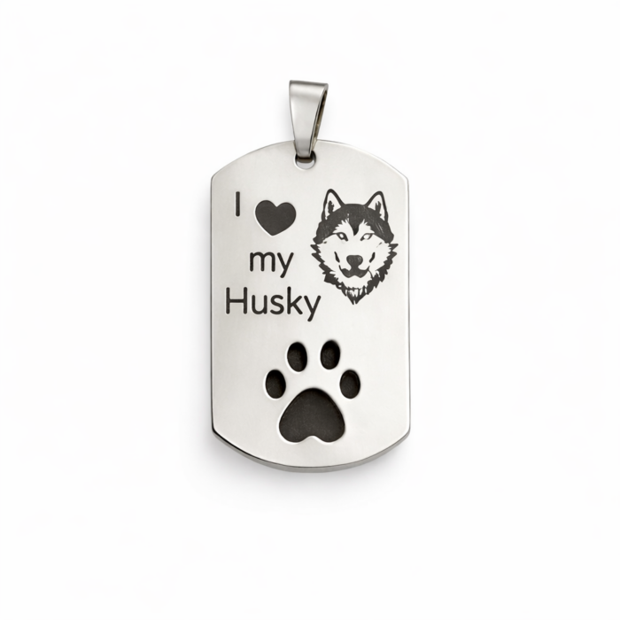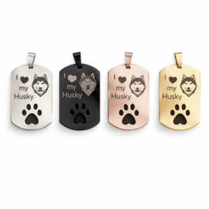 Hundemarke – Kettenanhänger: Entdecken Sie unsere exklusive Kollektion von personalisierten Plaketten, vielseitig einsetzbar, ob als Anhänger der Kette oder als Hundemarke, perfekt für jeden Husky-Liebhaber! Unsere Marken sind in vier stilvollen Farboptionen erhältlich: klassisches Silber, elegantes Schwarz, zartes Rosé und luxuriöses Gold. Jede Marke ist sorgfältig aus hochwertigem Material gefertigt und zeigt stolz das Porträt eines Huskys, begleitet von dem liebevollen Aufdruck „I ❤ my Husky“.