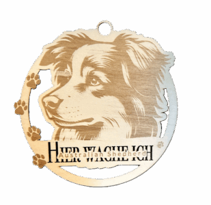 - Design: Detailreiche Gravur eines Australian Shepherds umgeben von Pfotenabdrücken